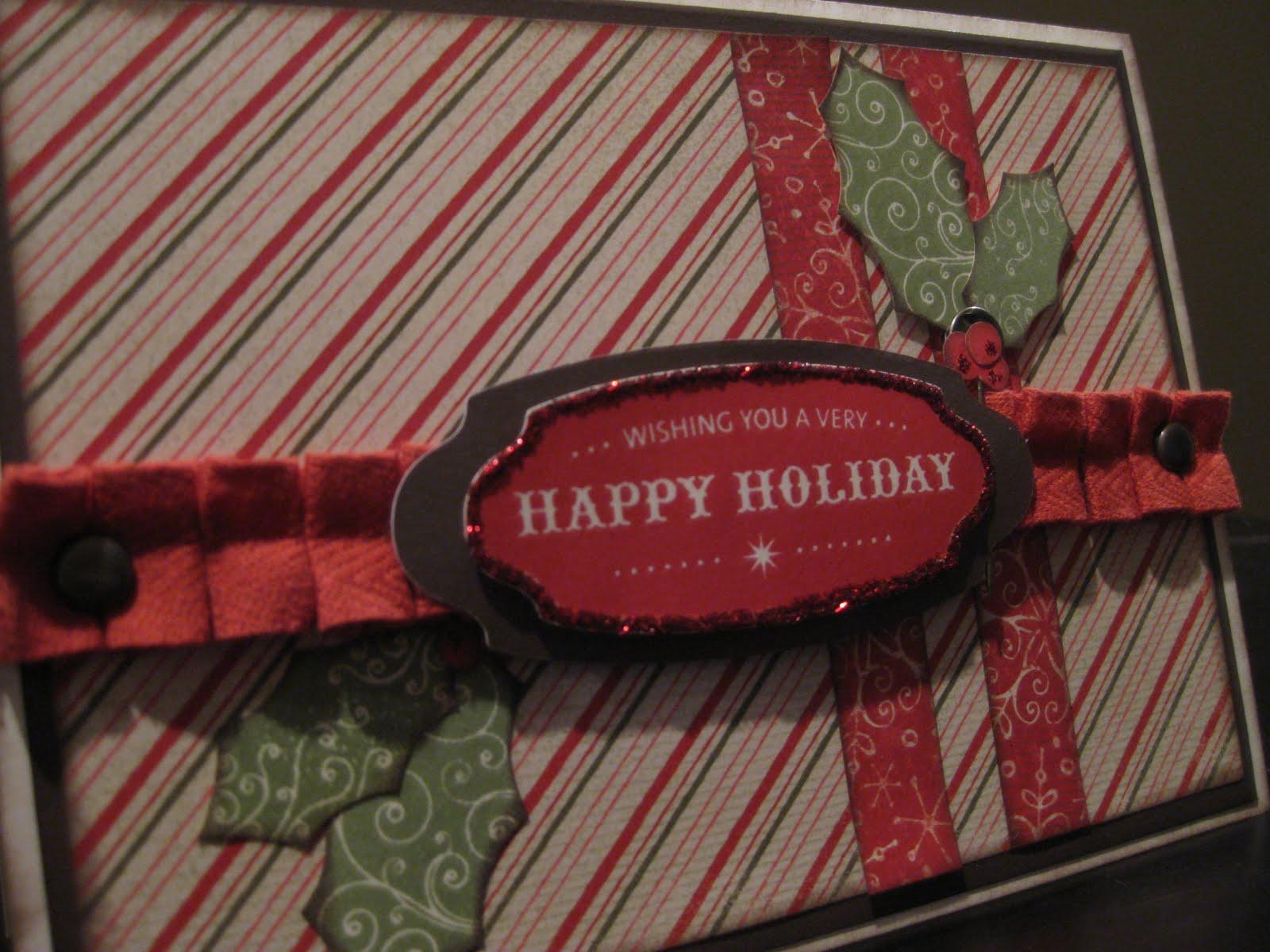 From this sketch, I arrived at this card. I used a 5x7 card base, cocoa and colonial white cardstock, Mistletoe papers and shapes from the awesome Cricut Art Philosophy cartridge. How ever did I craft without a Cricut for so long?